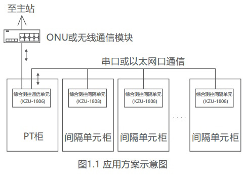 10kV環網柜自動化配電終端由一個綜合測控通信單元(KZU-1806)和多個獨立的保護測控間隔單元(KZU-1808)構成。綜合測控通信公共單元安裝于母線PT柜上部,保護測控間隔單元安裝于對應間隔的開關柜二次小室上部,綜合測控通信單元(KZU-1806)與保護測控間隔單元(KZU-1808)之間通過串口總線或以太網通信線(需配置以太網交換機)相聯實現信息的交互;綜合測控通信單元(KZU-1806)與主站之間通過無線或光纖通信實現信息的交互。如圖1.1所示: